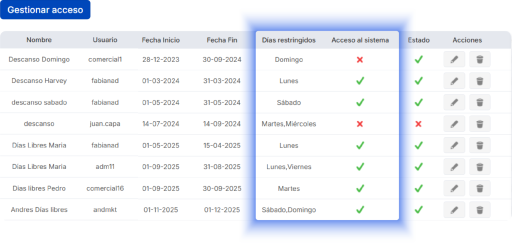 Determina los días en los que cada asesor recibe leads y en los que los usuarios tienen acceso al sistema.